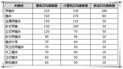 比如市民王先生想購買一臺4028臥式帶鋸床,他先在百度上輸入“帶鋸床”這個詞出來一些公司,一 一 查閱后感覺不滿意,他再輸入“臥式帶鋸床”這個詞搜索,還是不滿意,最后他用“4028臥式帶鋸床”搜索。其中帶鋸床、臥式帶鋸床、4028臥式帶鋸床,都是市民王先生用過的關鍵詞。