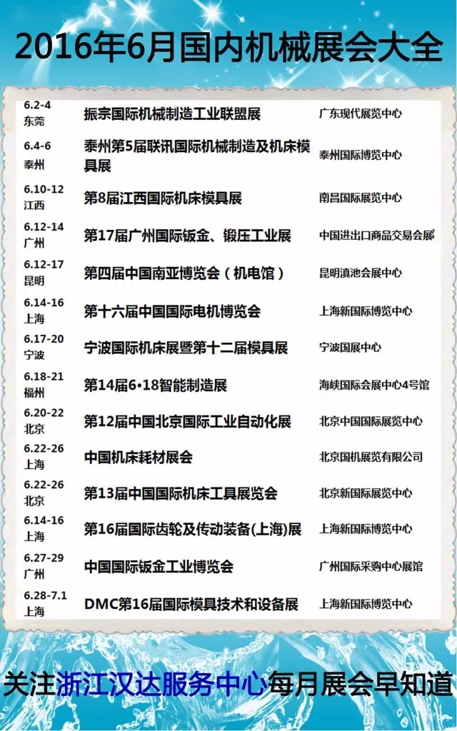 廣大工業(yè)機(jī)械從業(yè)者們,我們整理了2016年6月份展會一覽,展會時間、名稱、地點(diǎn)均有一一核對檢查,確保無誤,請各位放心參考。